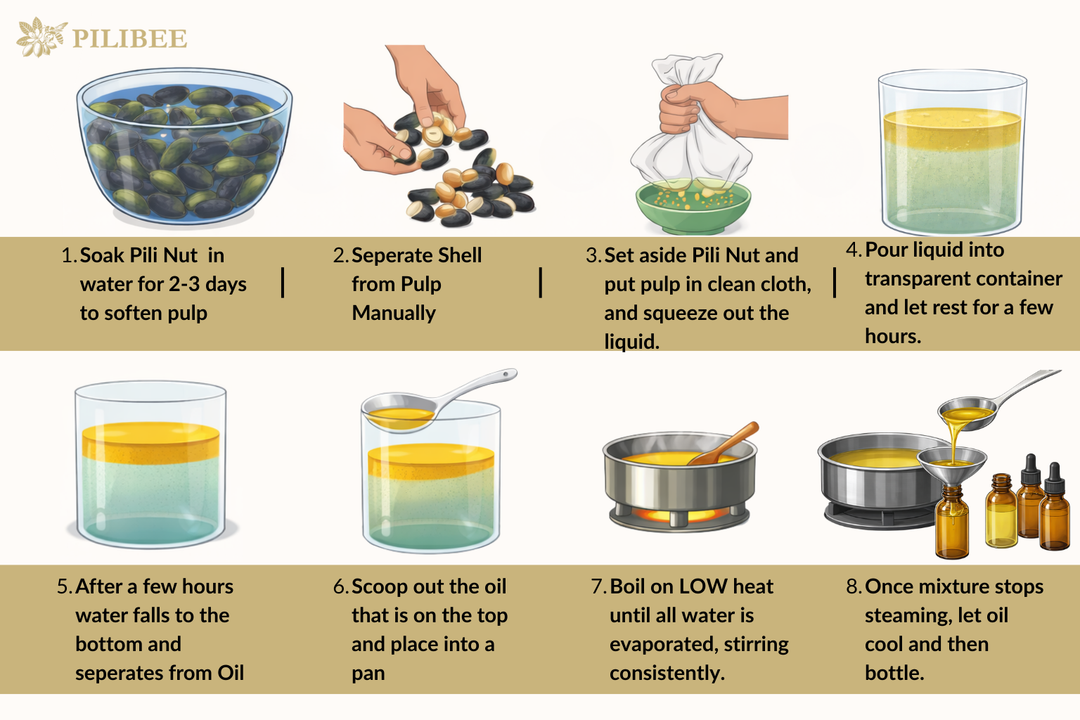 After harvesting, farmers in the Philippines soak Pili Nut husks in water for at least 3 days to soften the pulp and extract its oil.